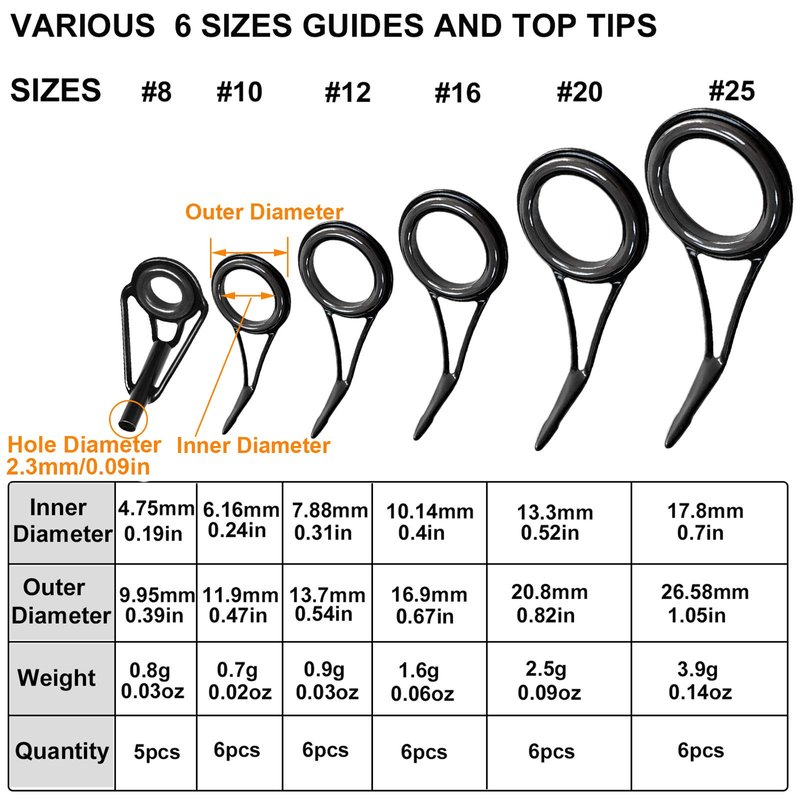 - VARIOUS SIZES SPINNIGN ROD GUIDES: Total 75pcs in box for storage, easy to carry outside. With a wide range of rods to repair , excellent kit for the dedicated multi-species angler. Guide Inner Diameter: 6#*10pcs(0.14in/3.6mm), 8#10pcs(0.2in/5.1mm), 10#10pcs(0.24in/6.2mm), 12#*10pcs(0.31in/7.9mm), 16#*10pcs(0.4in/10mm), 20#*10pcs(0.53in/13.5mm), 25#*10pcs(0.7in/18mm), 30#*5pcs(0.9in/23mm).