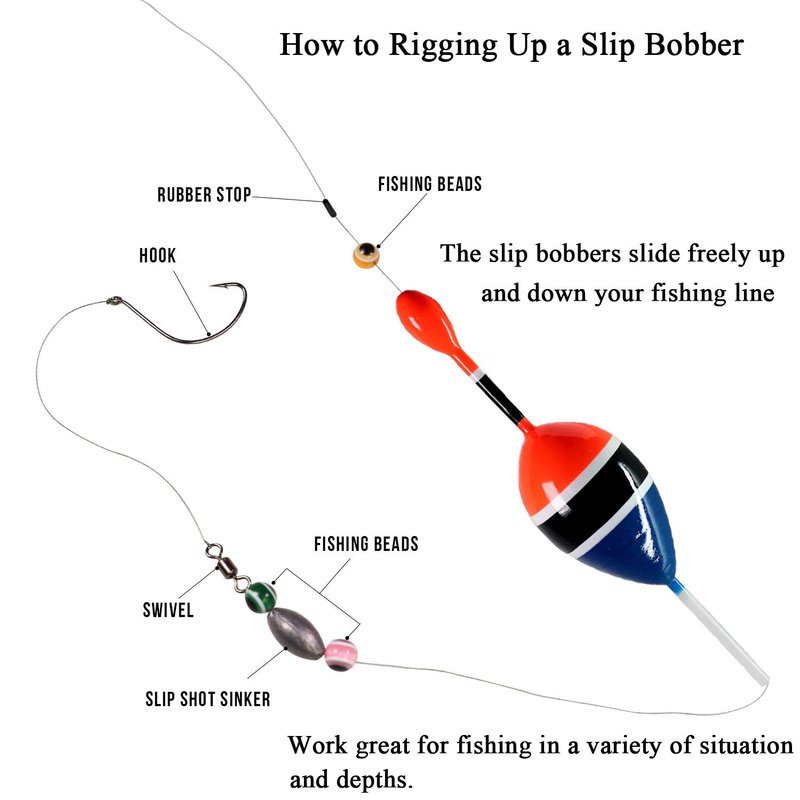 - 3. Adjustable Fishing Line Depth: You can set the line depth fishing with slip bobber. Slip bobbers work great to achieve greater depths without having excess line. To adjust depth, slide the bobber stop up or dowm on the line, you can fish as deep or shallow as you want.