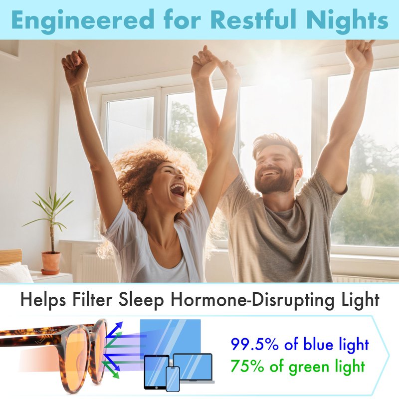 Amber orange glasses to block blue light for sleep Do you have trouble falling asleep and wake up tired regularly? Do you suffer from fatigue, migraines, or headaches from daily screen time? Exposure to the emitted high energy visible (HEV) blue light from smartphones, tablets, computers, TVs, and fluorescent light bulbs can disturb your sleep. THE EASY SOLUTION THL Sleep’s advanced amber blue light-blocking glasses for men and women support your sleep by protecting your eyes from harmful blue light while letting in maximum amounts of safe light. Wear when working on your PC, watching TV, or gaming to relieve eye strain as anti fatigue or gamer glasses. Orange blue light blockers reading glasses for men and women are a powerful tool to help you balance your daily light exposure in addition to getting natural blue light from the sun without sunglasses. A bonus with this type of orange lens glasses is that it can double as tinted migraine computer glasses for photophobia, or as light sensitivity glasses. THE BENCHMARK Clear, transparent, or yellow tinted lens blue light blocking glasses fail to block out enough dangerous light for nighttime use. Red lens blue light blocking sleep glasses risk being too dark for indoor use, similar to wearing sunglasses indoors. THL Sleep’s orange tinted glasses amber lens reading glasses have blue light spectrum elimination (BLSE) technology, which filters out 100% of the most disturbing light rays between 400 and 550 nm. The advanced lenses filter out 99.5% of blue and over 75% of all green light. For the ultimate blue light safety, the glasses need this high rate of filtration at night. THE PERFECT FIT THL Sleep’s orange computer screen blue blocking reading glasses for men and women are available in many different styles and uniquely offered as amber readers orange lens reading glasses.