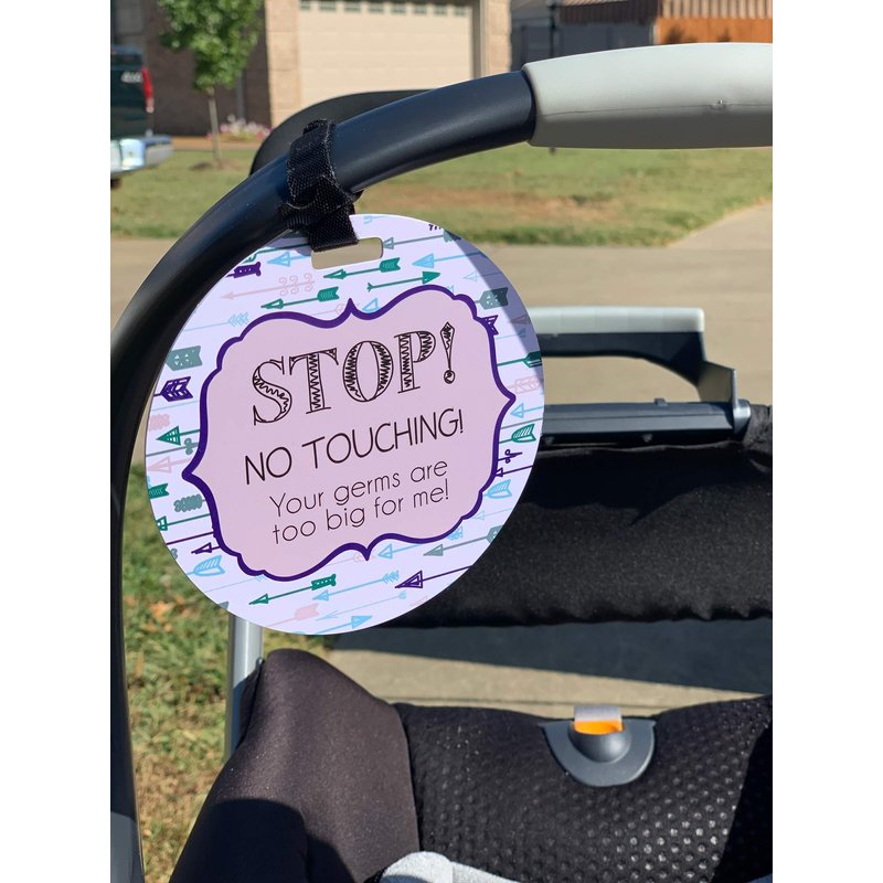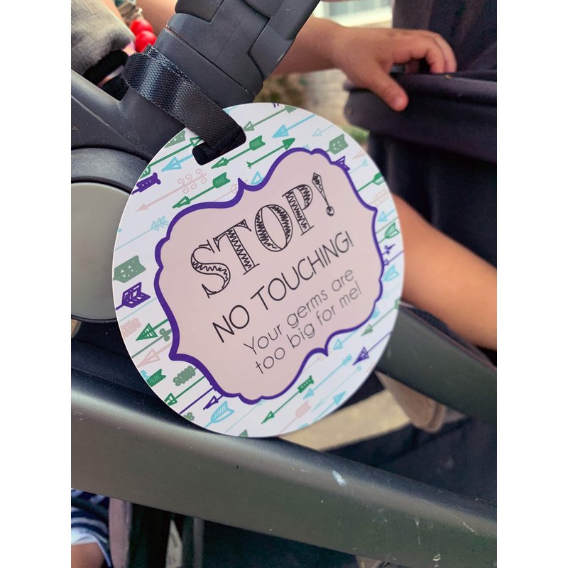 THREE LITTLE TOTS – Blue Arrow Modern Stop No Touching Baby Car Seat Sign or Stroller Tag - CPSIA Safety Tested