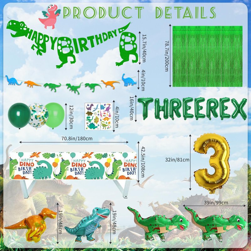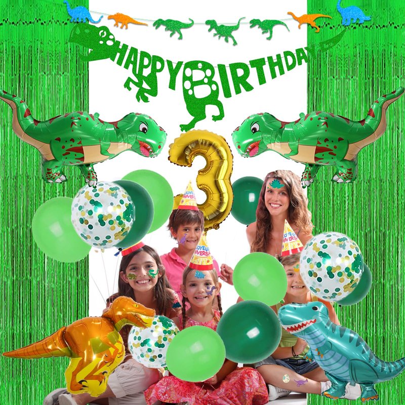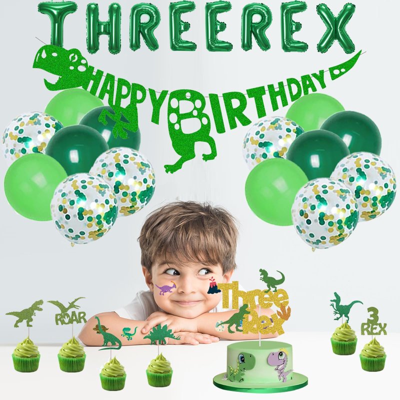 - Three Rex Birthday Party Decorations Include: 1 Pcs Happy Birthday banner, 1 Pcs dinosaur banner, 2 Pcs green party fringe curtains, 1 Pcs tablecloth, 4 Pcs dinosaur foil balloons, 1 Pcs number “3” foil balloons, 8 Pcs THREE REX letter foil balloons, 15 Pcs latex balloons (three colors), 1 Pcs large cake topper, 12 Pcs cupcake toppers, 2 Pcs tattoo stickers.