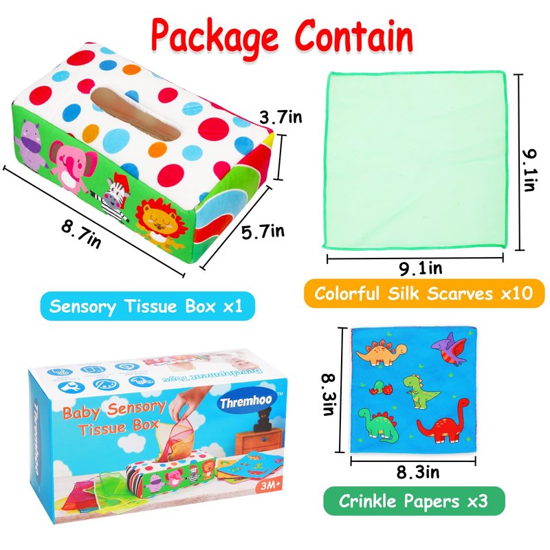 baby toys 6 to 12 months developmental The magic tissue box baby toy set with 1 cotton tissue box, 4 bright and stimulating crinkle tissues & 10 rainbow colors shiffon tissues. The patterns of crinkle tissues including animals, dinosaurs, numbers, alphabet, fruit & cars. The best montessori toys for babies 0-6 6-12 months, infant toys 0-3 3-6 6-12 months, sensory toys for babies 6-12 months.