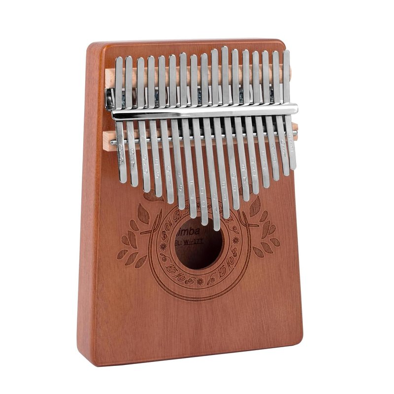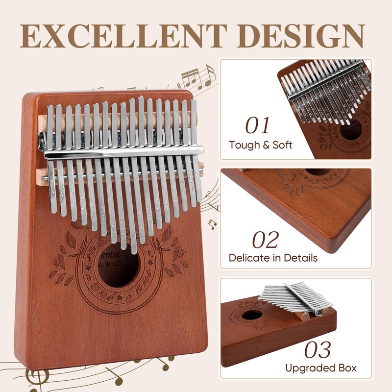 - 【MATERIAL & STRUCTURE】This particular kalimba has a cabinet made of mahogany with an attractive carved design around the sound hole. The 17 keys are made of selected ore steel, a tough but pliable metal. The end of the key is slightly curved downward. The overall design allows you to feel comfortable while playing. Notes are engraved on surface of the keys for easy playing