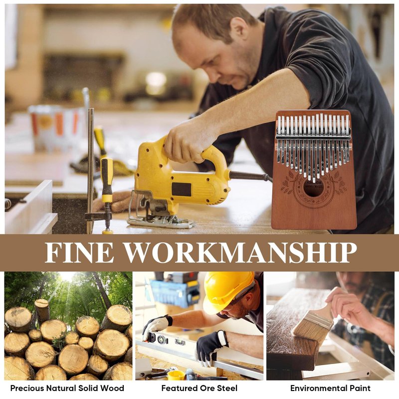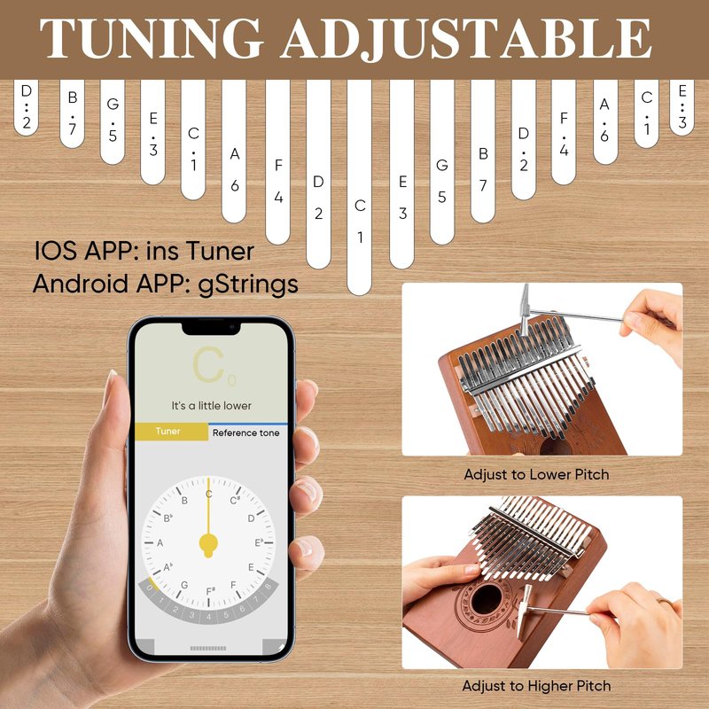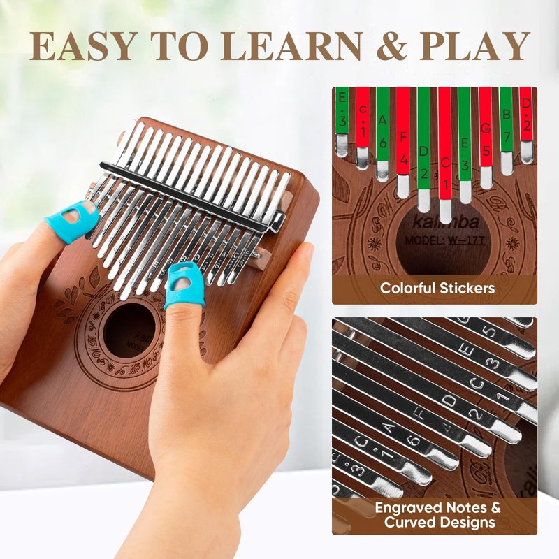 - 【BEAUTIFUL SOUND】The sound is sweet and pleasant, with a warm mahogany-like richness of tone. The finger piano body is made of solid wood and box structure, with strong resonance and a crisper, louder and longer sound. The kalimba 17 keys tuned in C are staggered for flexibility and wear resistance, and produce a pleasant resonant sound when played gently, ideal for acoustic playing
