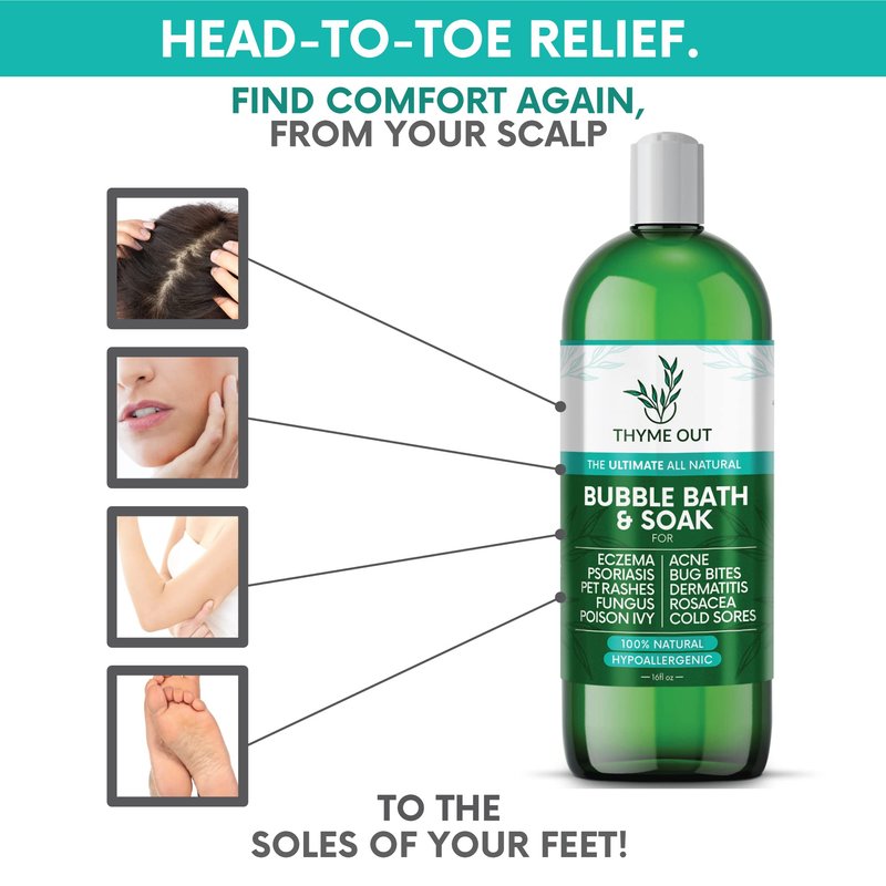 - REPLENISH & EASE COMMON SKIN ISSUES - Having trouble with eczema, psoriasis, rosacea, rashes and dry skin? No problem! Instantly soothe and smooth your irritated skin by following your relaxing skin-quenching soak with our exclusive Thyme Out Skin Treatment directly on your skin issue. Even better, you can add the Thyme Out Mask and Thyme Out Face and Body Wash to your regimen to surely keep your skin issues under control..naturally!
