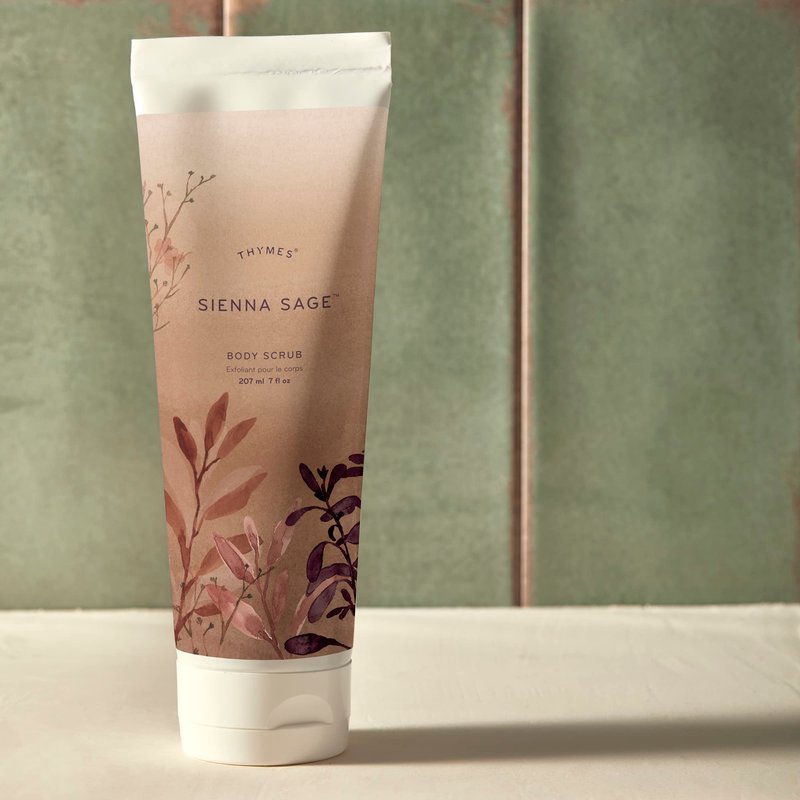 - Thymes Sienna Sage Body Scrub: Scrub away the day with this consciously crafted exfoliating body scrub. Enjoy this blend of hydrating sodium hyaluronate, walnut shell powder to exfoliate, and argan oil to soothe and moisturize.