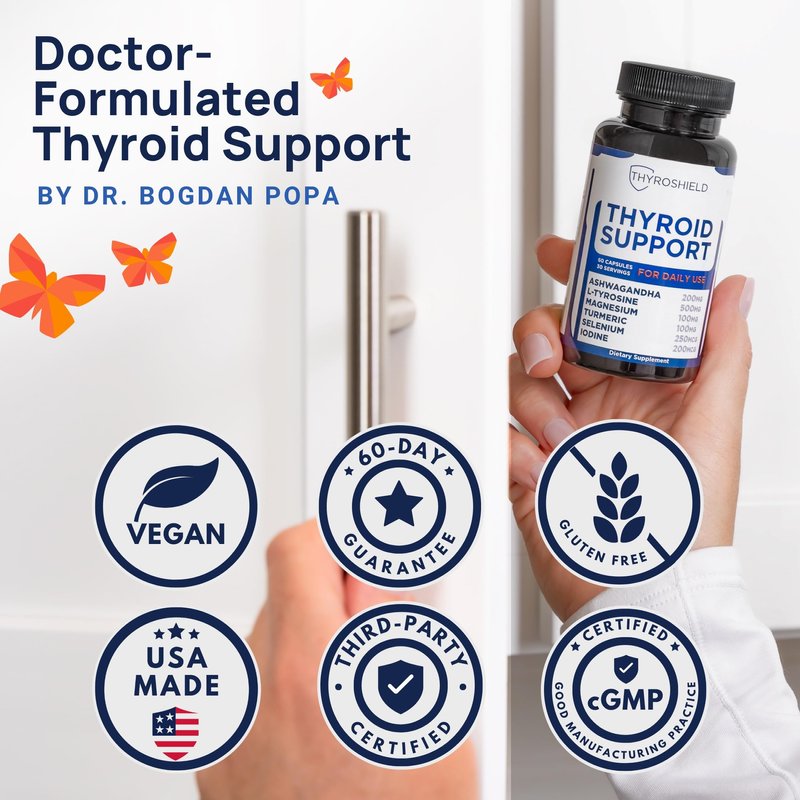 - Advanced Thyroid Support with Clinically Researched Nutrients - ThyroShield offers a powerful thyroid support complex with iodine, selenium, L-tyrosine, ashwagandha, magnesium, and turmeric. These nutrients promote thyroid hormone activity and support endocrine health, energy, and metabolism. It’s ideal for women and men seeking pure thyroid support, thyroid balance, and a natural thyroid supplement made with traceable ingredients.
