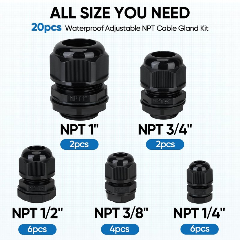 TICONN 20 Pcs IP68 Waterproof Cable Gland Kit Nylon NPT Adjustable Cable Connectors Assortment 1/4” 3/8” 1/2” 3/4” 1“ for Waterproof Junction Box Wire Pannel (Black, 20 Pcs)