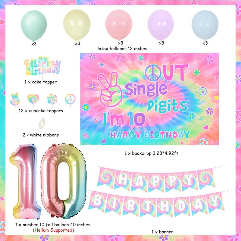 - Tie Dye 10th Birthday Party Decorations for Girl: This package includes 12 latex balloons 12 inches, 1 number 10 foil balloons, 1 banner, 1 backdrop 4.92*3.28 ft, 1 cake topper and 12 cupcake toppers, which can decorate a unique and beautiful girl’s 10th birthday party, peace out single digits I’m 10 theme birthday party well.