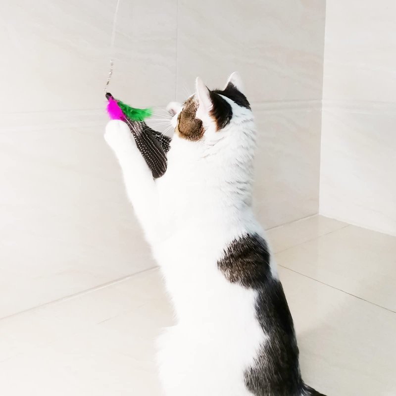 - [Natural Feather Non Toxic]: Cat feather teaser toy is made from safe, non-toxic, eco-friendly material. Our feathers are all nature and all dyes are non-toxic. It is safe and enjoyable for your cats.But that doesn't mean they can be swallowed. Pay attention to your cats behavior to prevent choking