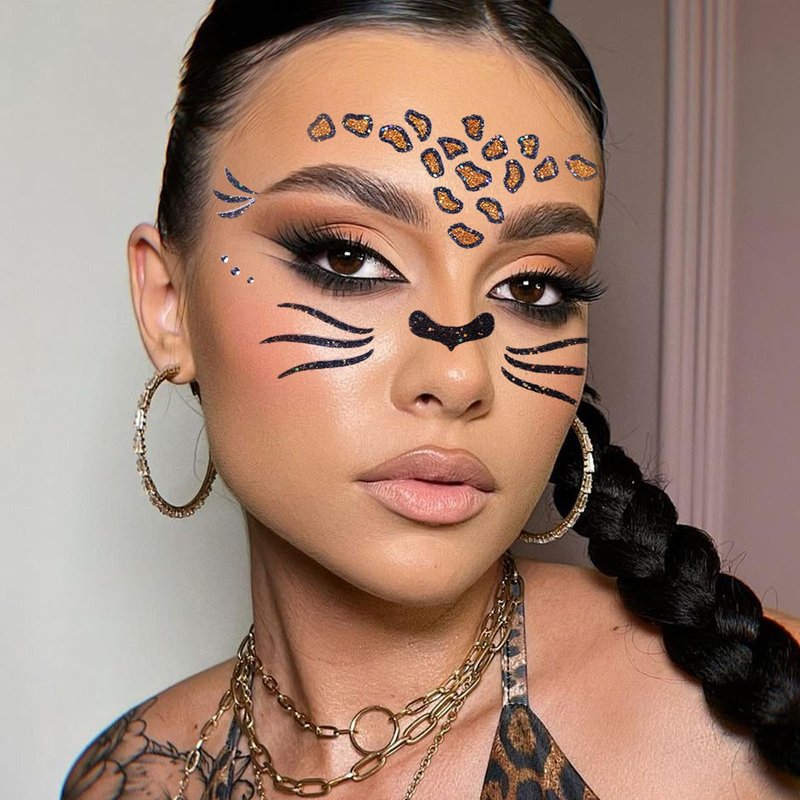 - 𝐐𝐮𝐚𝐧𝐭𝐢𝐭𝐲: Each set includes 2 face stickers, one featuring a tiger design and the other a leopard design, both in vibrant and glittering colors to make your look stand out.