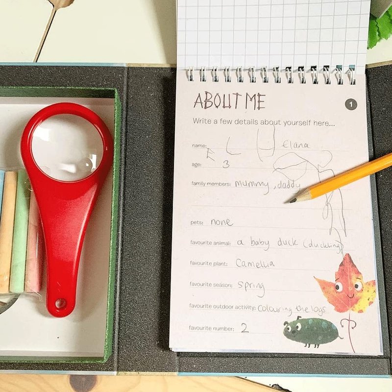 - SET INCLUDES: 1x magnifying glass, 6x colored chalk, HB Pencil, 36 page outdoor activity book, Handy storage box.