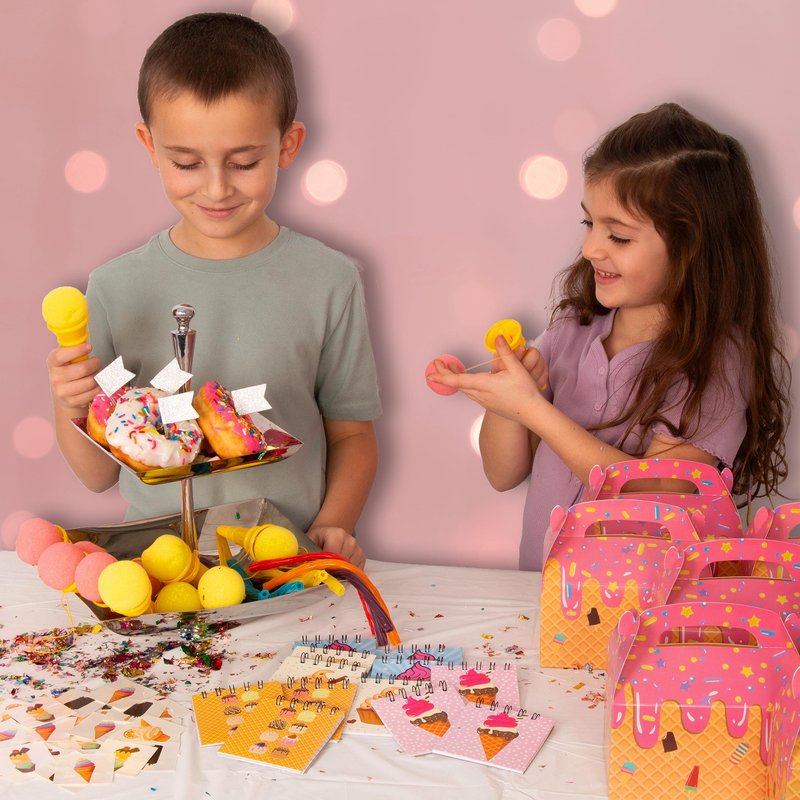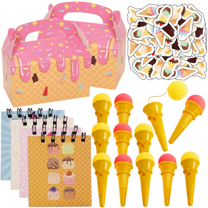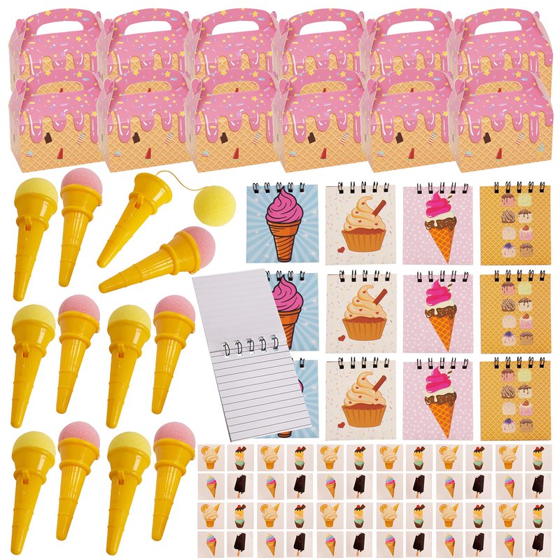 - This Ice Cream Themed Party Favor Set includes 12 party favor boxes, 12 notepads, 12 ice cream popper toys and 144 tattoos! These party sets are an adorable addition to any ice cream themed party!