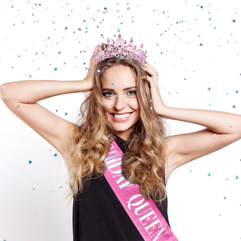TIHEBAX Birthday Tiara and Sash for Women Girls Birthday Queen Series Graceful Birthday Crown and Sash for Party Gift Halloween Cosplay Premium Rhinestone Headbands for Princess Dress Up (pink)