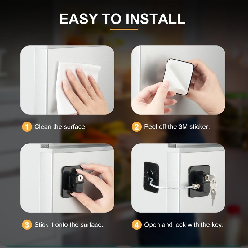 - EASY INSTALLATION: Installing our refrigerator lock is simple and convenient, requiring no drilling or damage to surfaces. It comes with strong adhesive stickers. Simply clean the area where you want to apply the lock and Paste on a clean, smooth and flat surface without oil, no peeling, no paint off. Use 24-48 hours after the adhesive is stuck to ensure the greatest degree of adhesion!