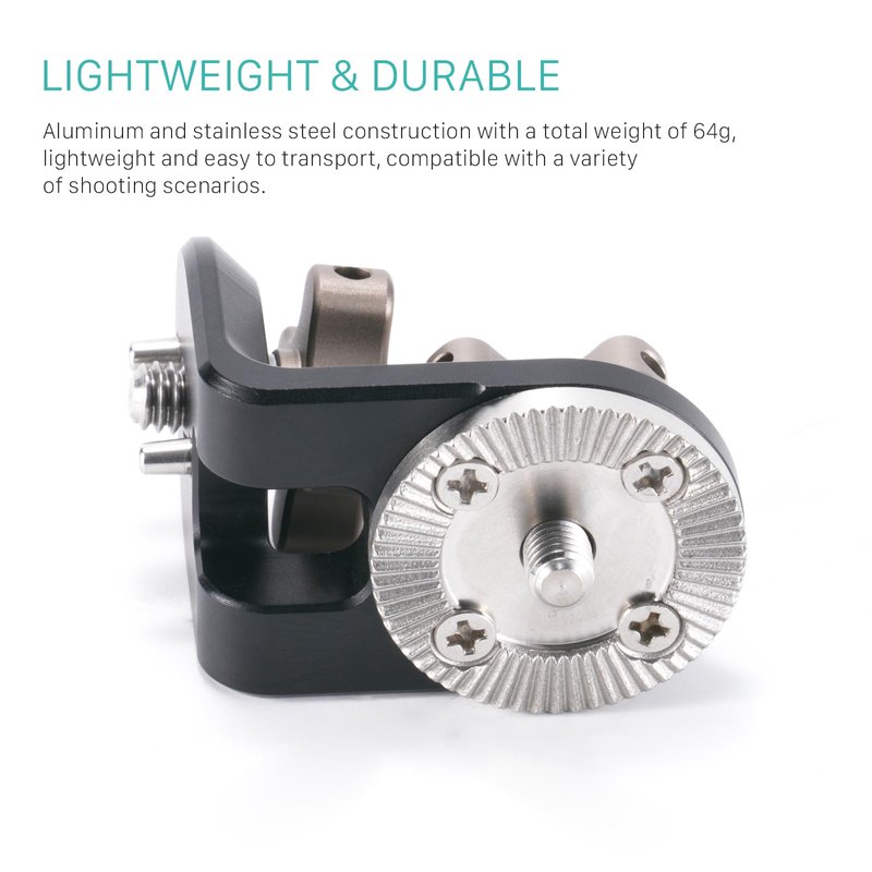 The Right Angle Rosette Adapter to 1/4″-20 with Locating Pins is a flexible option for mounting various accessories via two universal standards. This accessory features an Arri Standard Rosette on one side and a 1/4″-20 screw with locating pins on the other side of a 90 degree bracket. This is the perfect option for mounting our Nucleus Nano II Control Handle to the Rosette Arms of our Lightweight Shoulder Rig. The right angle design of this adapter is also ideal for mounting other accessories close to your camera body such as wireless video transmitters. The inclusion of thumbscrews means that you do not need any additional tools to install or remove this accessory.