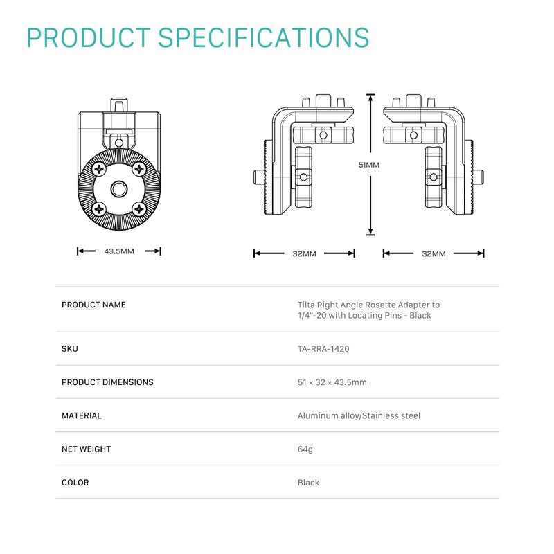 Tilta Right Angle Rosette Adapter to 1/4″-20 with Locating Pins | Compatible with Nucleus Nano II Control Handle & Lightweight Shoulder Rig | Aluminum Alloy and Stainless Steel | Black | TA-RRA-1420
