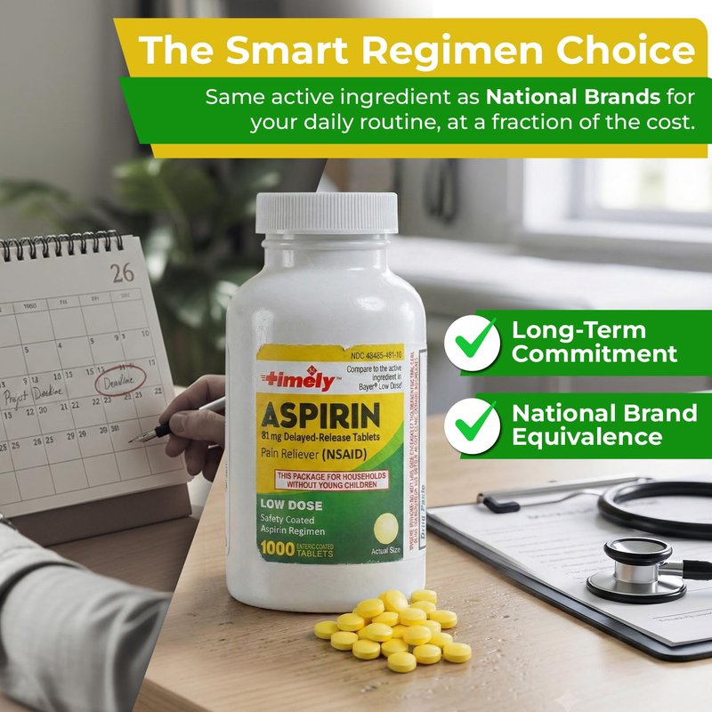TIME-Cap Labs 1000 Tablets Low Dose Aspirin 81mg Enteric Coated - NSAID Pain Reliever & Fever Reducer for Adults, Helps with Minor Aches, Headaches, Muscle Pain, Toothaches, and Joint Discomfort
