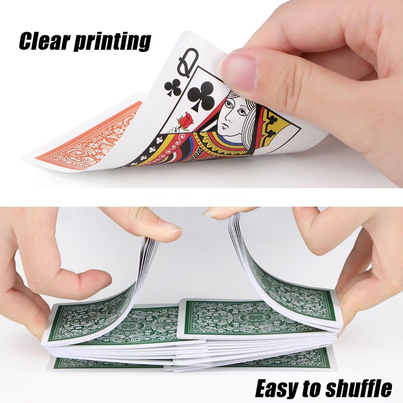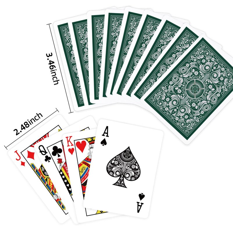 - Wide Poker Size Regular Index:2 Decks of playing cards includes 1 Green and 1 Orange,Each deck contains 52 suited cards and 2 jokers, 3.5 in x 2.5 in size(63mm x 88mm)
