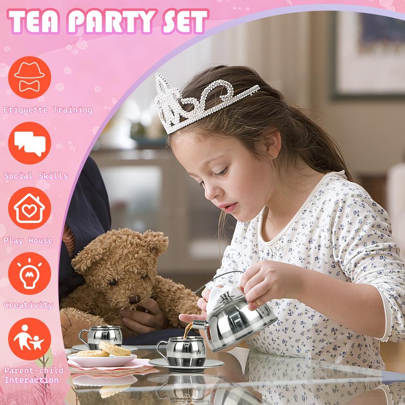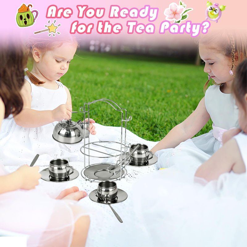 Timy Kids Tea Party Set 14pcs for Girls, BPA Free Stainless Steel Tea Set Pretend Kitchen Toys