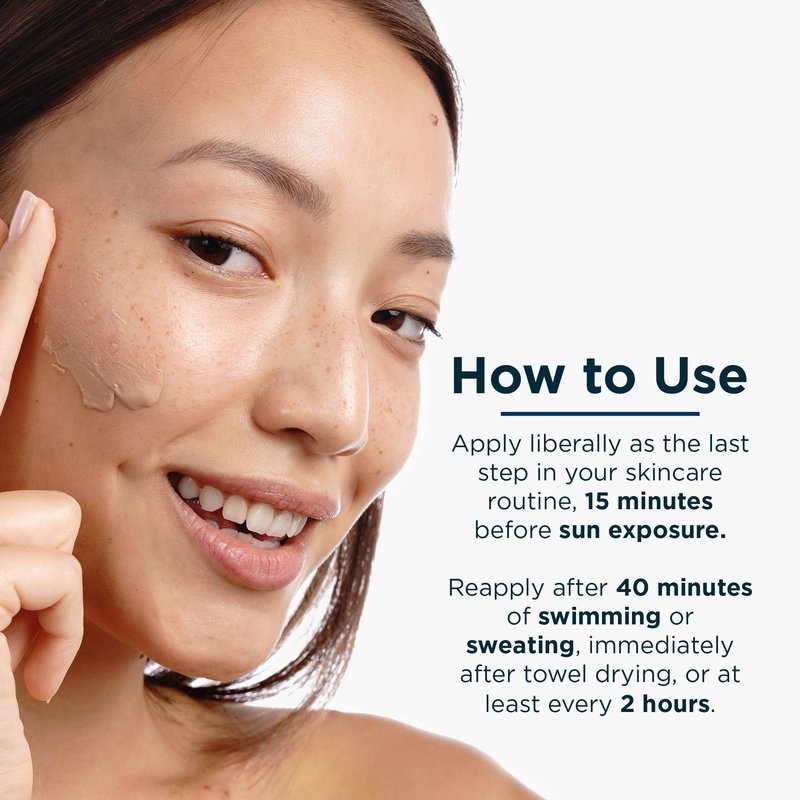 - How to Use: Apply as the last step in your skincare routine, 15 minutes before sun exposure. - Reapply after 40 minutes of swimming or sweating, immediately after towel drying, or at least every 2 hours.