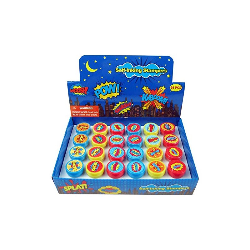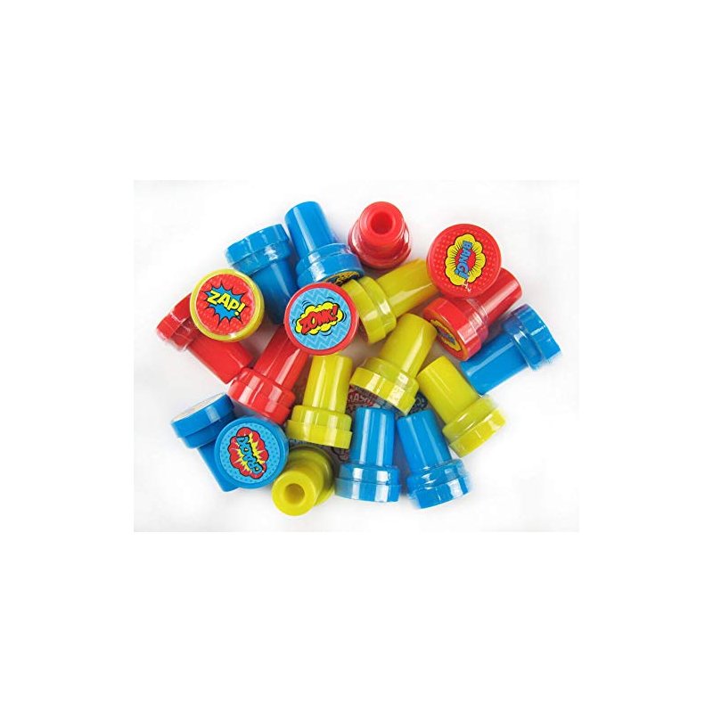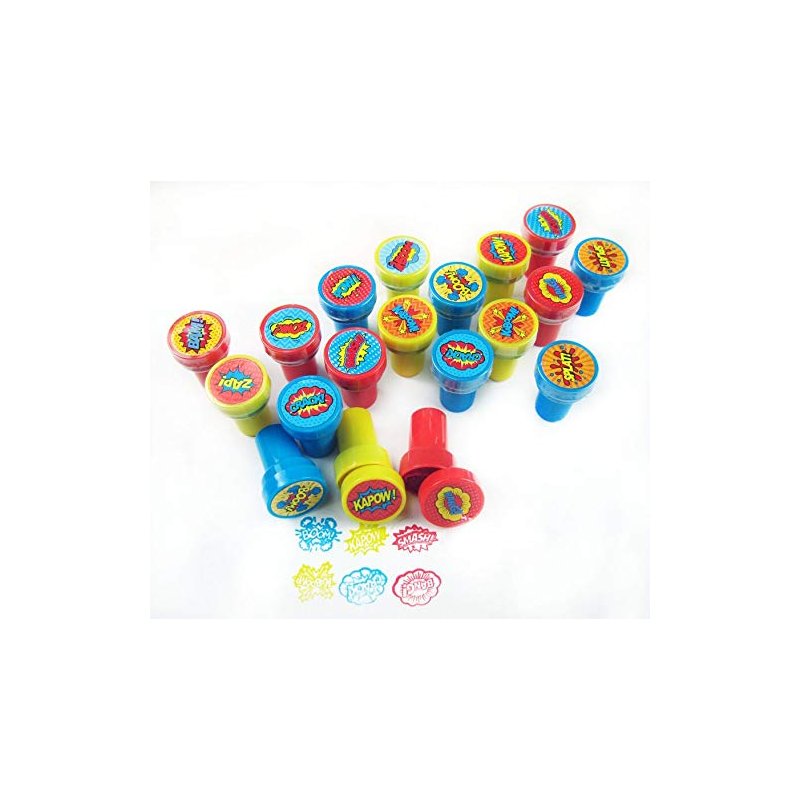 Kaboom! Pow! Smash! Put these awesome superhero word bubbles in your party favor bags! These stampers are also great for school projects, chore charts, creating your party invitations, scrapbooking and decorating stationery. Have this stamp assortment in your party favors bags or the crafts table at your party, for home, in the classroom, or in art class! Our stamps are non-toxic, lead-free have passed all CPSIA and ASTM testing. Safe for children to use. 1.5 inches tall, 1 inch in diameter