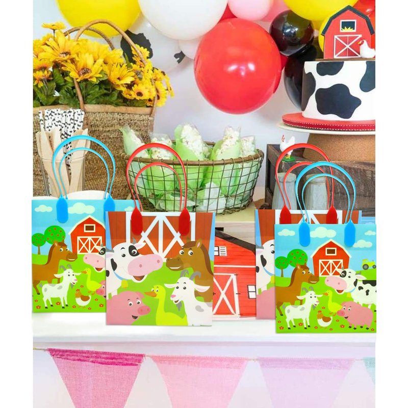 - Perfect for any toddler barnyard farm animals parties and celebrations! Candy goodie bags for birthday are great for cow birthday party supplies to go with farm balloons, cow balloons and other farm animal party supplies! Bags are also strong enough to put farm animal toys. These anial themed party decoration will be so pretty place on the cake table!