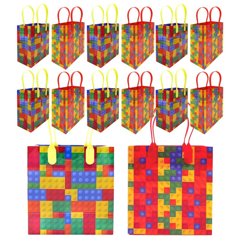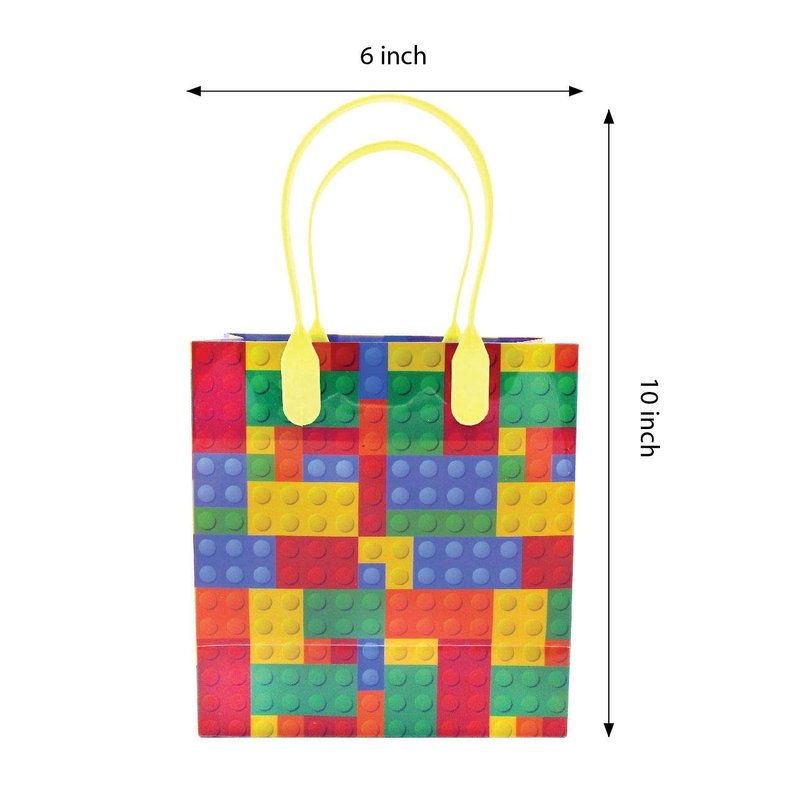Are you a master builder? These building blocks party favors are perfect for your party! Fill up the goody bags with favors, candy, toys and so much more! The handles are sturdy so you don't have to worry about them breaking! Each bag measures appx 7 inches tall, 6.25 inches wide, 3 inches deep. Each set comes with 12 assorted bags