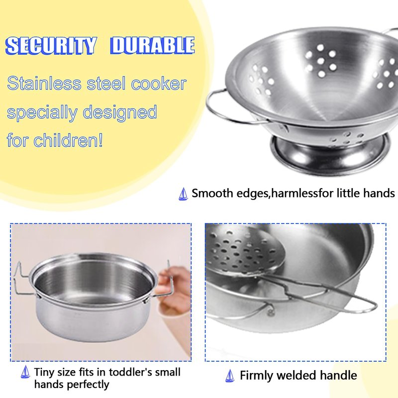 - 【KIDS PLAY KITCHEN ACCESSORIES 】Very classic stainless steel kitchen cooking toy mini pots and pans for kids all come in a cute gold bag.Includes a colander,2 soup pots with lid ,a bowl,a saucer,4 cooking utensils(Spoon,whisk, Strainer Spoon,Pasta Spoon),and a soft pad. ❤❤▶Designer Specially designed for children's small hands and toddlers little hands,It's normal for us adults to feel small, Tiny sizes are more fun to play with,The perfect size for kids.