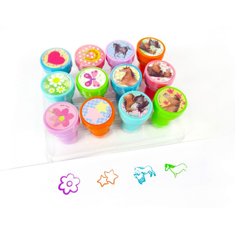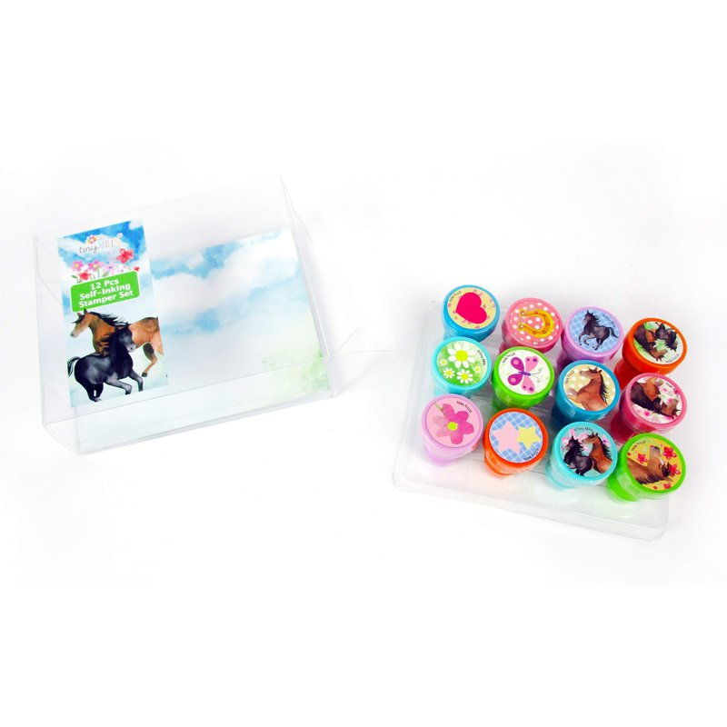 Our horse and pony stamper kit makes the perfect gift for any horse lover! These colorful and magical stampers will make perfect party favors for a western themed birthday celebration! This stamp kit also make a great Easter basket stuffer! These stampers come in a cute plastic reusable box. Have this stamp assortment at home, in the classroom, or in art class! Our stamps are non-toxic, lead-free have passed all CPSIA and ASTM testing. Safe for children to use. 1.5 inches tall, 1 inch in diameter.