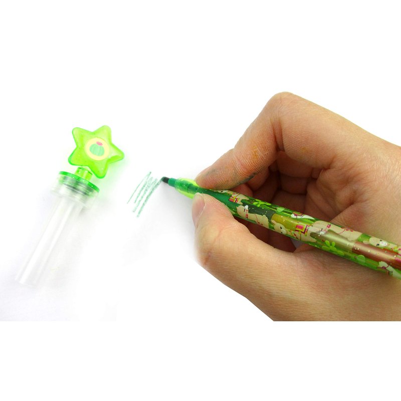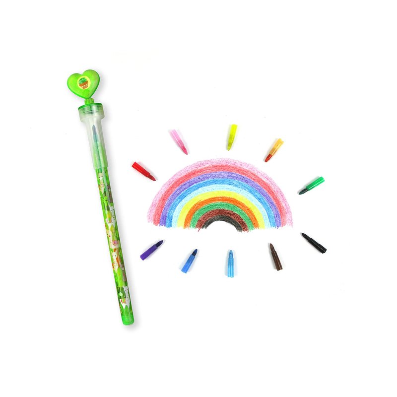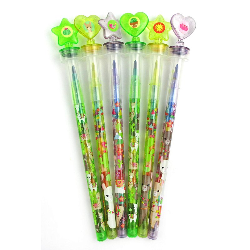 - 24 llamas stacking crayon pack comes with a display box. Each crayon contains different colored leads, red, blue, yellow, orange, green, purple, pink, black, dark blue. Kids cam change out the colors in one crayon! So convenient and easy. Plus each stacking crayon has a self-inking stamp on top so kids can be more creative with their drawings and decorations! Kids can draw and stamp with the same stacking crayon!