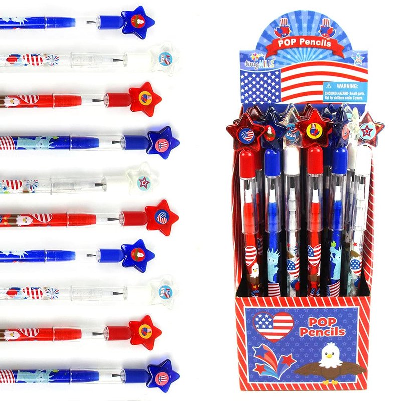 TINYMILLS 24 Pcs Patriotic 4th of July Multi Point Stackable Push Pencil Assortment with Eraser for Carnival Prize Goodie Bag Stuffers Party Favors for 4th of July BBQ, parties, parades, canivals