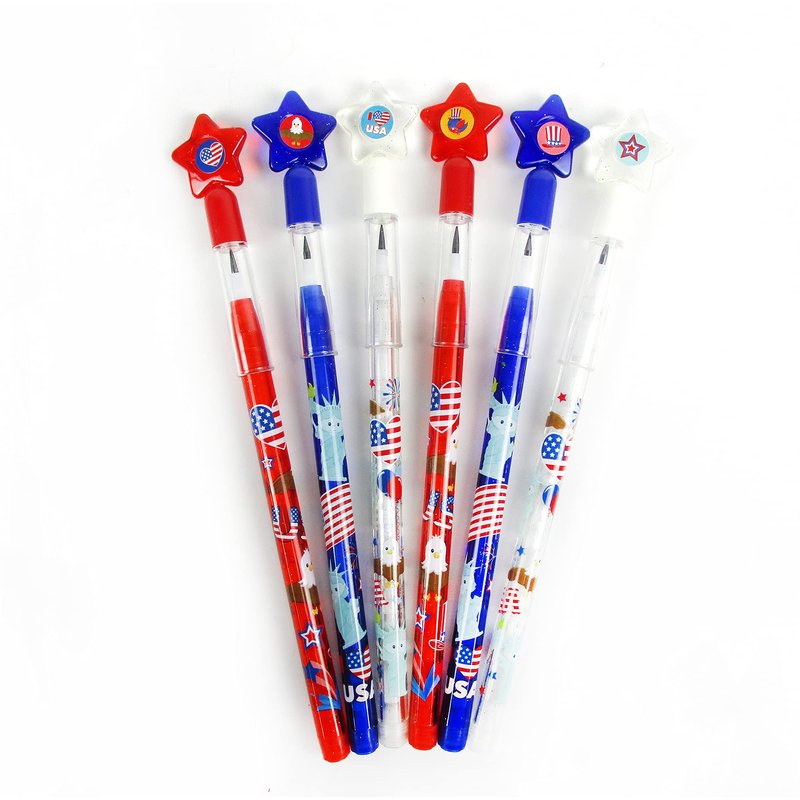 - 24 4th of July pencils in patriotic red blue white colors! These 4th of July stacking pencils with non-sharpening leads are great favors to give out at parades, parties and BBQ's!