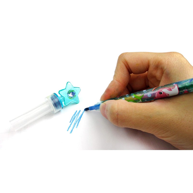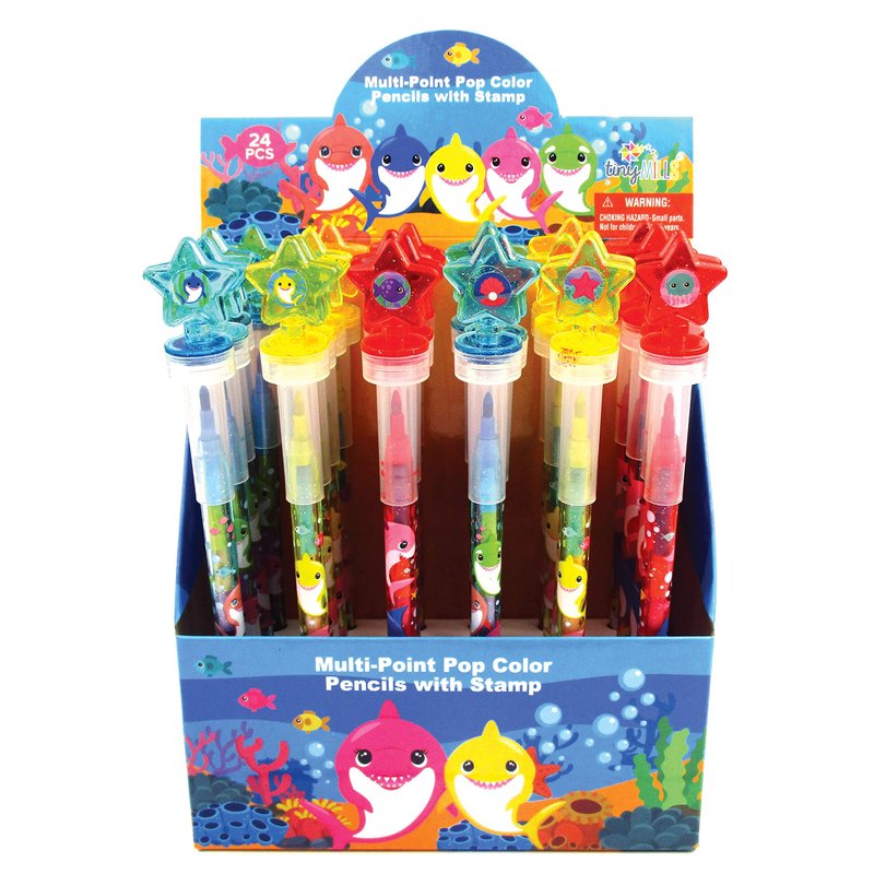 - 24 shark and under the sea stacking crayon pack comes with a display box. Each crayon contains different colored leads, red, blue, yellow, orange, green, purple, pink, black, dark blue. Kids cam change out the colors in one crayon! So convenient and easy. Plus each stacking crayon has a self-inking stamp on top so kids can be more creative with their drawings and decorations! Kids can draw and stamp with the same stacking crayon!