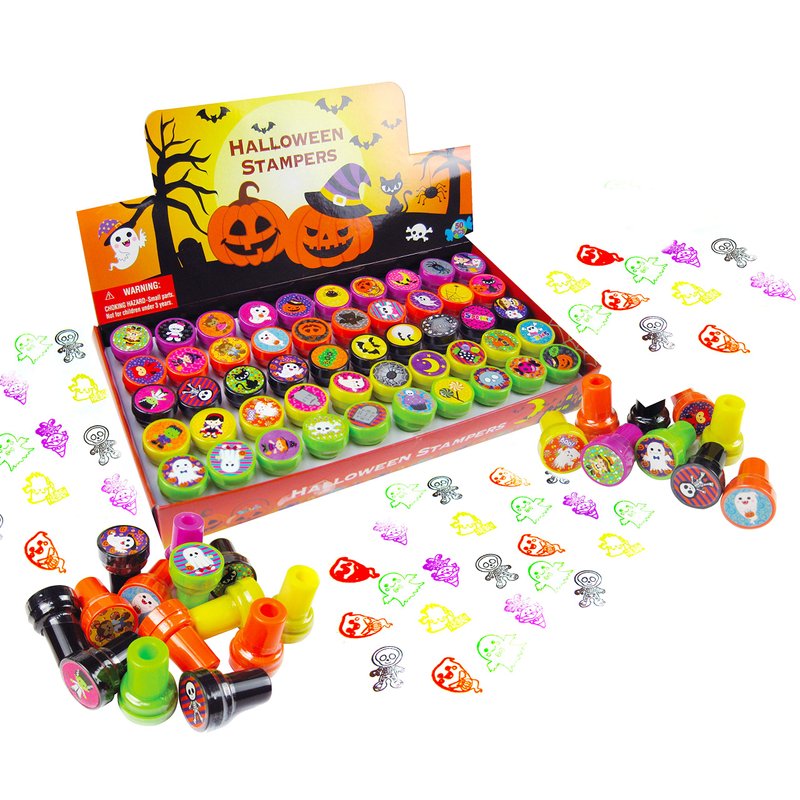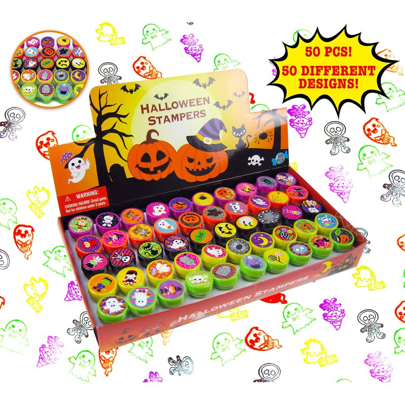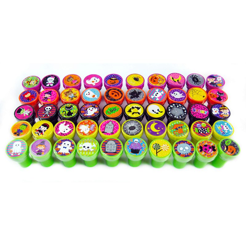 - Bulk pack of Halloween stamps with 50 DIFFERENT cute and spooky stamp designs! No repeat designs! Stamp favors for kids includes pre-inked colors are orange, black, purple, lime green, yellow. Each plastic stamp is individually sealed to ensure shelf life and the caps won't fall off in goody bags!