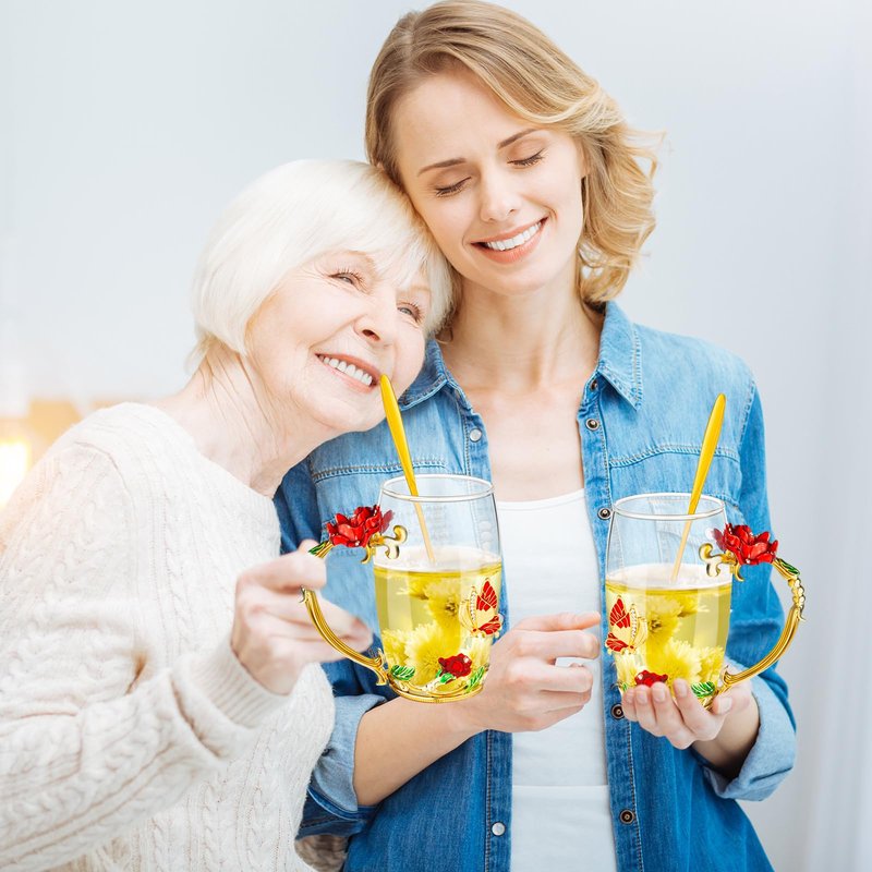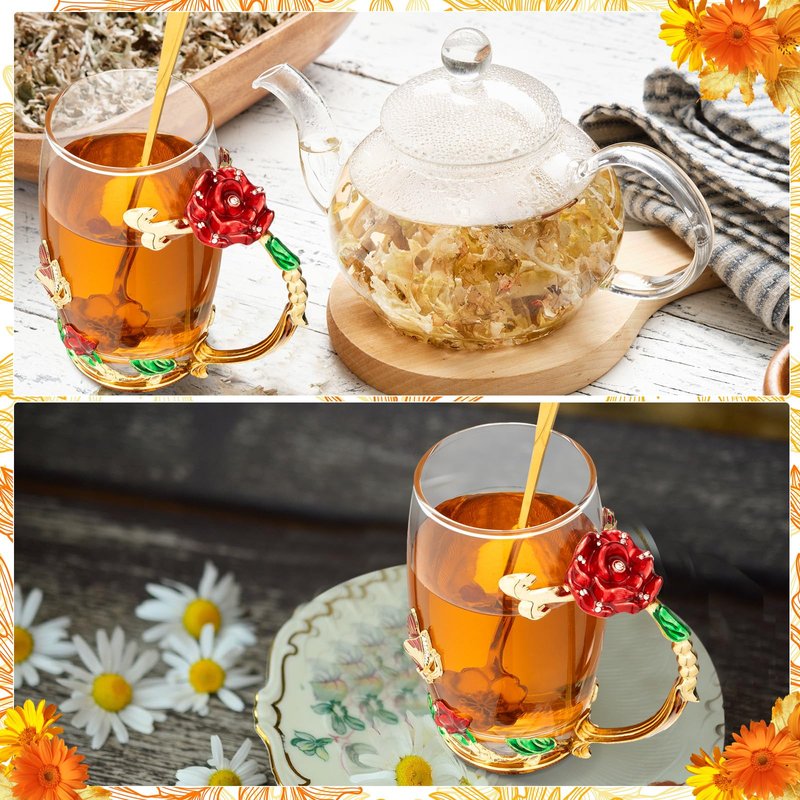 Tioncy 2 Sets Gifts for Mom Birthday Gifts for Mom Women Enamel Flower Glass Tea Cup with Spoon Enamel Glass Coffee Mugs for Wife Sister Grandma, Mother's Day Graduation Retire Gifts(Red)