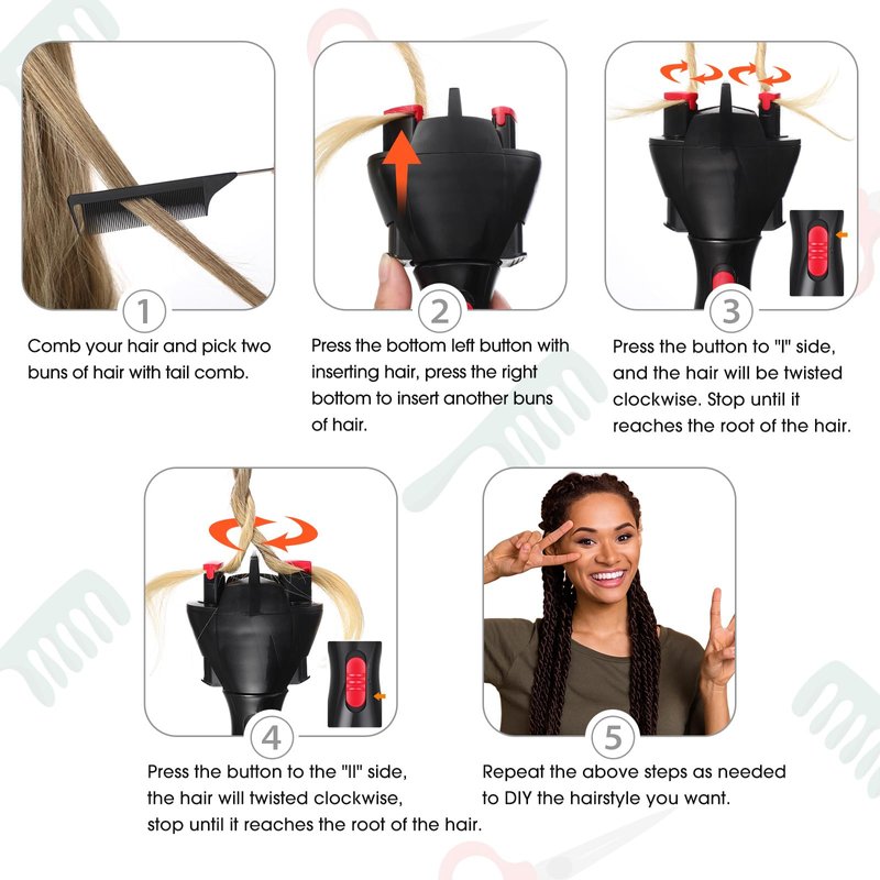 - Easy Using Steps: put 2 buns into the hair clips on both sides, release the button to clamp the hair; Push the switch up to start braiding the 2 buns hair, then push the switch down to wrap the 2 buns knot together, remove the braiding device after braiding; Finally tie the hair with a headband