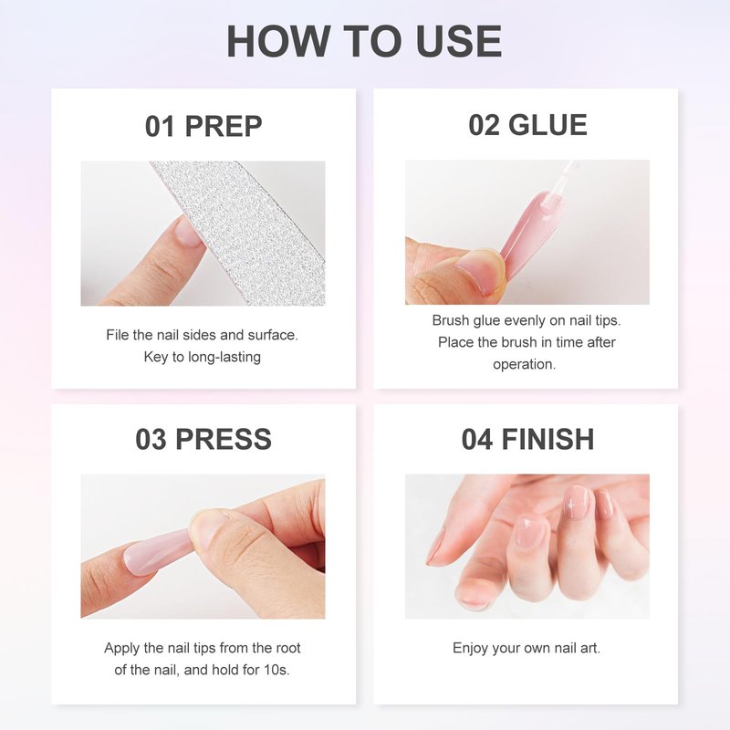 - Expert Adhesive: Acrylic nail glue is fast drying, quick bonding, adhesive perfect, long lasting for 14-30 days. You can take cooking and cleaning with them, no worry about popping off.