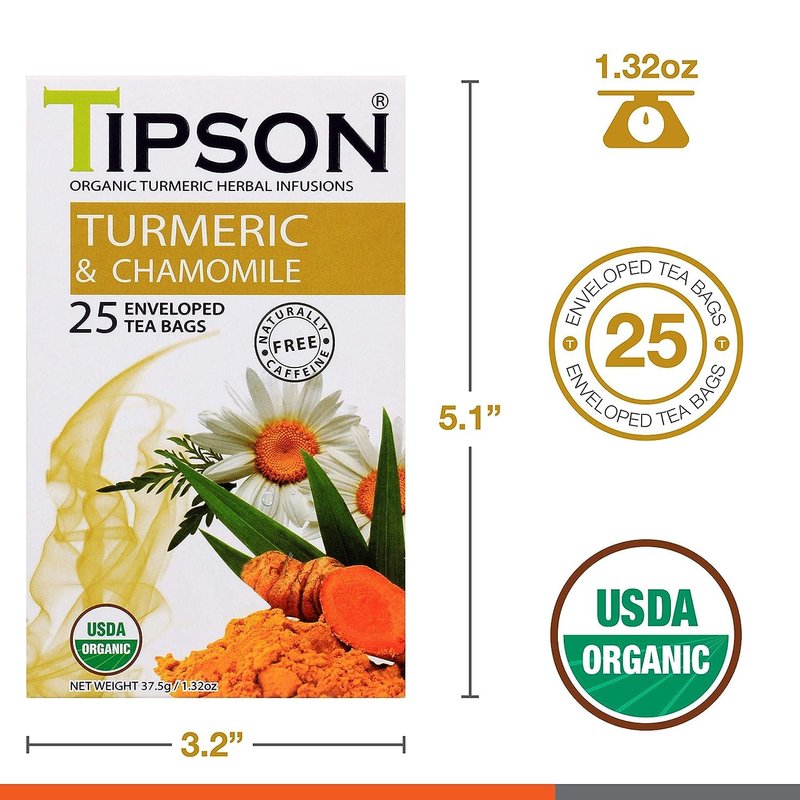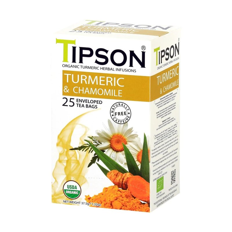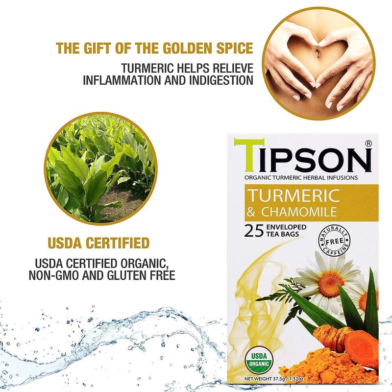 Tipson Organic Turmeric Herbal Infusions - Turmeric & Chamomile - Caffeine Free, Non GMO, Gluten Free - 25 Premium Tea Bags (Pack of 1)