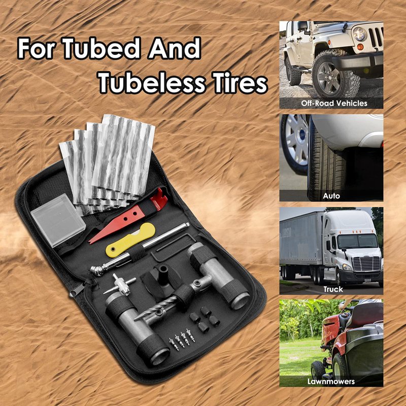 - SIMPLE BUT COMPLETE - Contains 1pc Zinc-Alloy T-handle insert tool, 1pc Zinc-Alloy T-handle spiral probe tool, 20pcs 4"(self-vulcanization plugs), 1pc pencil gauge, 1pc small crowbar, 4pcs plastic caps, 4pcs valve core, 2pcs L-type hex tool, 1pc 4-way tool, 1pc small transparent box, 1pc knife, 1pc manual, 1pc Nylon carry bag