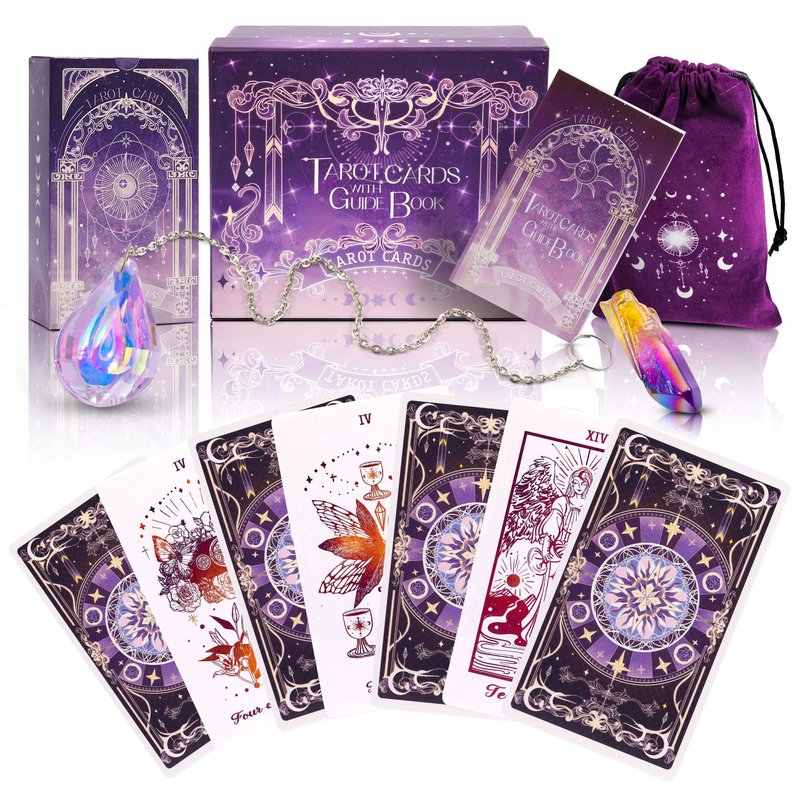 TIRLANO 78 Tarot Cards with Guide Book - Tarot Deck Gift Set with Tarot Cloth, Chakra Stones & Tarot Bag, Purple Tarot Cards Fortune Telling Game Craft Cardboard for Beginners and Expert Readers