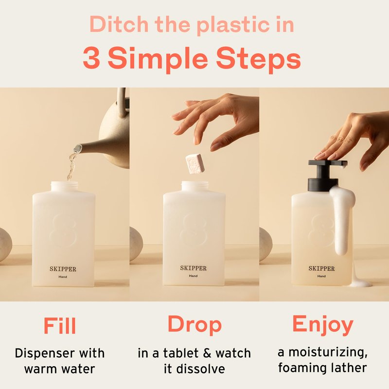 Tirtyl / Skipper are the leading suppliers of safe, effective, foaming hand soap tablets. Our single starter kits contain 3 tablets, each dissolving in your tap water to produce 8 to 10 oz of moisturizing foaming hand soap. Say goodbye to single-use plastic.