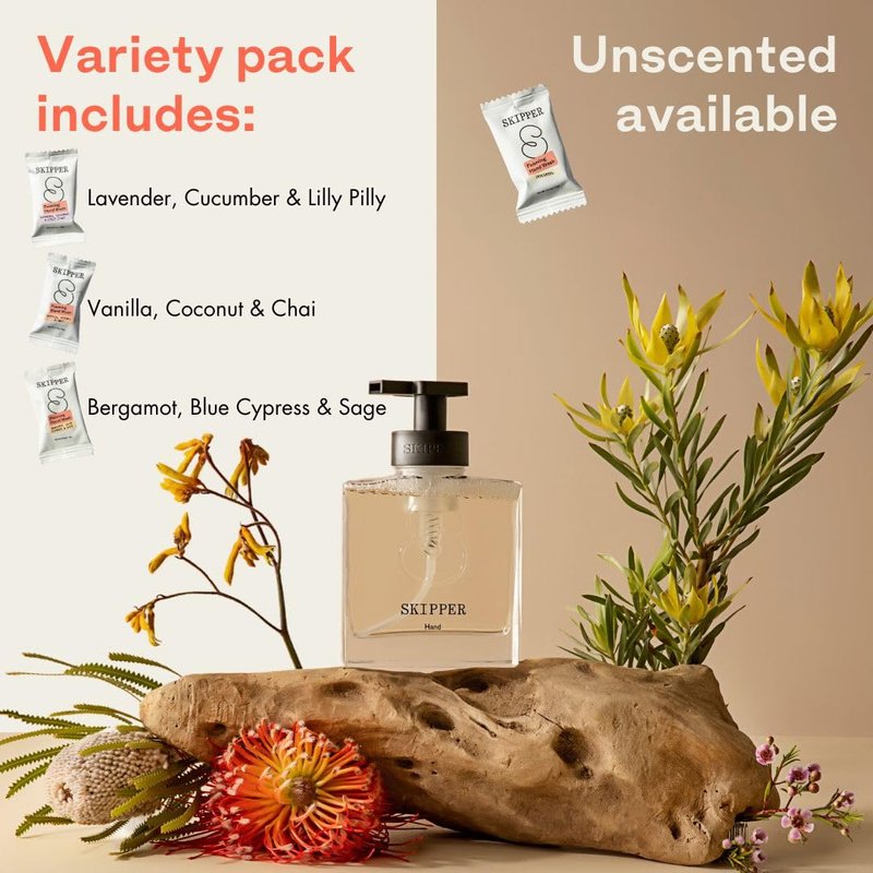 - ✅ REUSABLE FOAMING HAND SOAP: Buy a bottle once, refill forever with Skipper hand wash tablets in certified compostable packaging. The glass single kit includes 1x glass dispenser, 1x ‘Vanilla, Coconut & Chai’, 1x ‘Lavender, Cucumber & Lilly Pilly’, and 1x ‘Bergamot, Blue Cypress & Sage’ refill tablets.