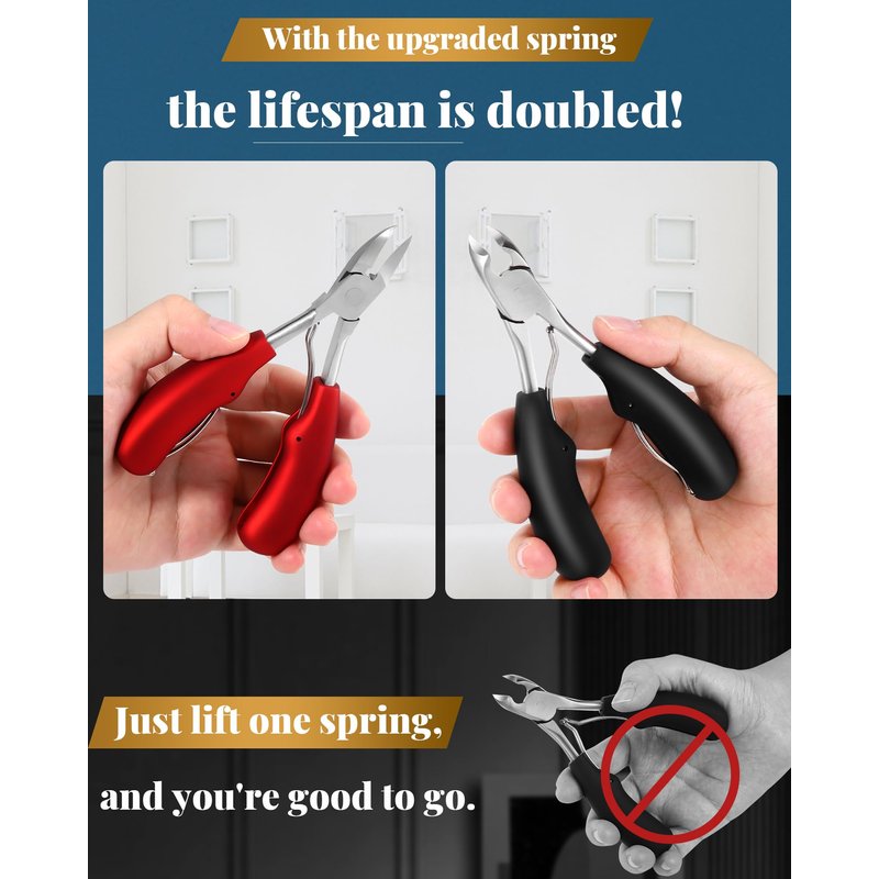 - [Podiatrist Toenail Clippers]The high-precision stainless steel sharp and curved blades spread up to a maximum distance of 1.57 inches, and the length of the blade is 0.78 inches,suitable for trimming ingrown toenails on both sides of the toenail, keep your toes hygienic and less painful. The red ABS material handle is ergonomically designed, comfortable to hold, soft and non-slip, and easy to cut. In addition, the double spring design provides double protection and prolongs the service life.