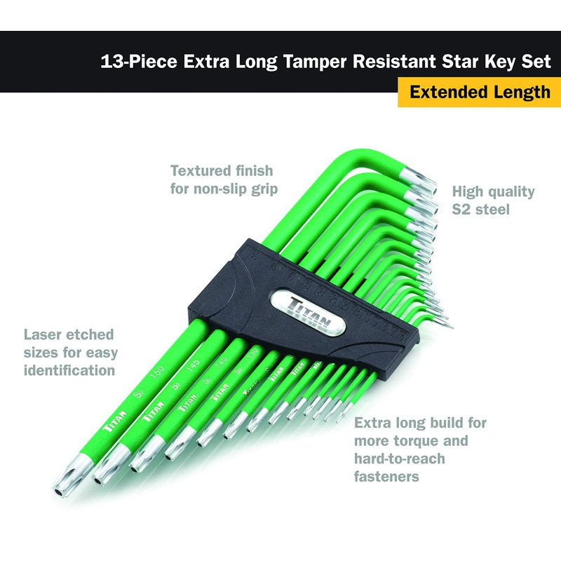 Titan 12715 Extra-Long Arm Tamper Resistant Star Key Set - 13 Piece , Green