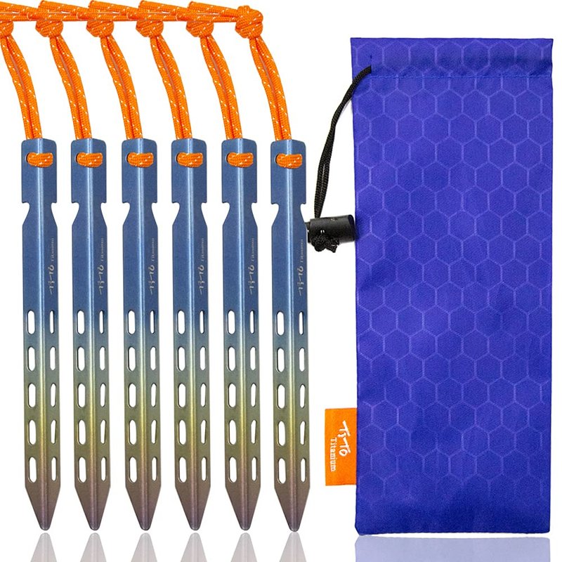 TiTo 6 Pack Titanium Tent Stakes 10X10X160mm V-Shaped Windproof Tent Nail Pegs with Carrying Pouch for Camping, Hiking, Gardening and Canopy (Colorful,10X160mm)