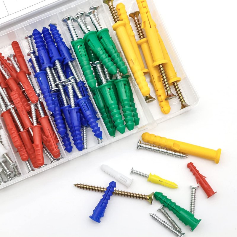 - Plastic anchors and screws separated by size in a sturdy plastic box, convenient for your use and storage