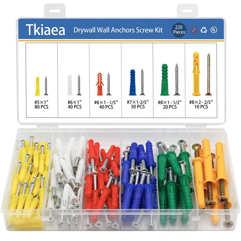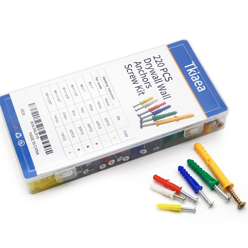 Tkiaea Drywall Anchors and Screws Kit 220Pcs, 110 Drywall Anchors, 110 Drywall Screws, Includes 6 Different Size
