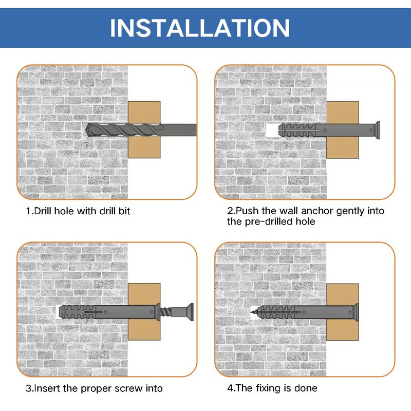 - Wall anchors are made of eco-friendly material, corrosion resistance, good toughness, drywall screws are made of quality galvanized carbon steel, they have rust resistance