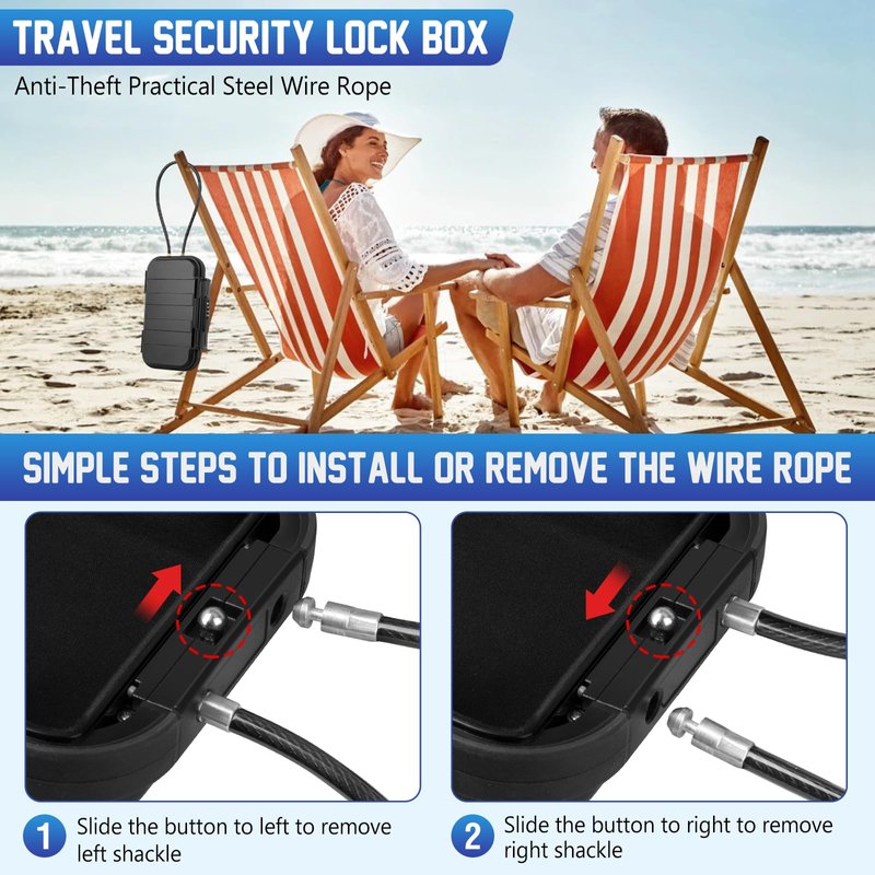 TNIIFXC Portable Travel Safe Lock Box 4-Digit Combination Mini Safe Box, Anti-Theft Beach Security Lockbox Waterproof Small Lockable Box with Removable Wire Rope for Dorm Beach Hotel Car Home Office